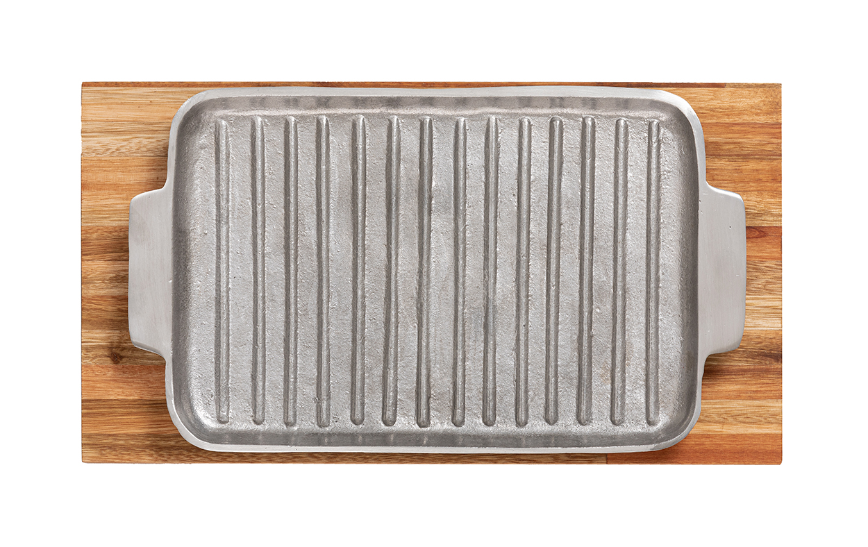 Bifera de aluminio 34x20x3,5 cm, con base de madera 40x22x2 cm, elaborada en madera de eucalipto reforestado que se caracteriza por su gran durabilidad y baja porosidad. Ideal para poder servir en la mesa lo que gustes y mantenerlo caliente. Viene incluida una bolsa de algodón ajustable para poder transportarla. Se entregan curados con aceite mineral. Es una tabla fabricada en listón corrido, pegada y prensada, esto evita que la tabla se arquee.Tipo de Pack: Bolsa | Peso Bruto: 2 gr | Largo: 40 cm | Ancho: 22 cm | Alto: 2 cmCaja MasterUn/CM: 5 | Peso bruto: 10 kg | Largo: 40 cm | Ancho: 22 cm | Alto: 10 cm | Volumen: 8,8 lt, Materiales: Aluminio,Madera