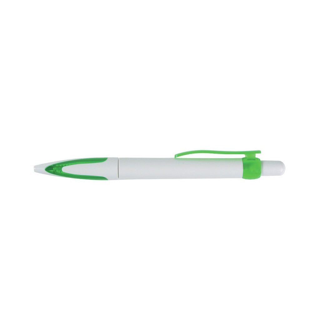 Bolígrafo plástico de cuerpo blanco con clip y grip en colores con transparencia. Apertura con pulsador. Tinta Negra 700 m de longitud de escritura.