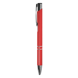 Aluminio. Cuerpo metálico de color. Clip, punta, y pulsador color plata. En el centro del bolígrafo cuenta con dos arandelas y más arriba finalizando el clip cuenta con una muesca color plata. Tinta negra