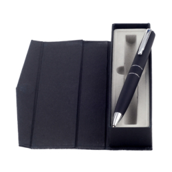 Metal. Cuerpo metálico engomado. Clip y detalles color plata. Apertura giratoria. Tinta negra. Estuche con cierre magnético. Destape electroplateado en la parte superior. Presentación en estuche con cierre magnético.