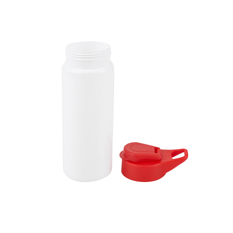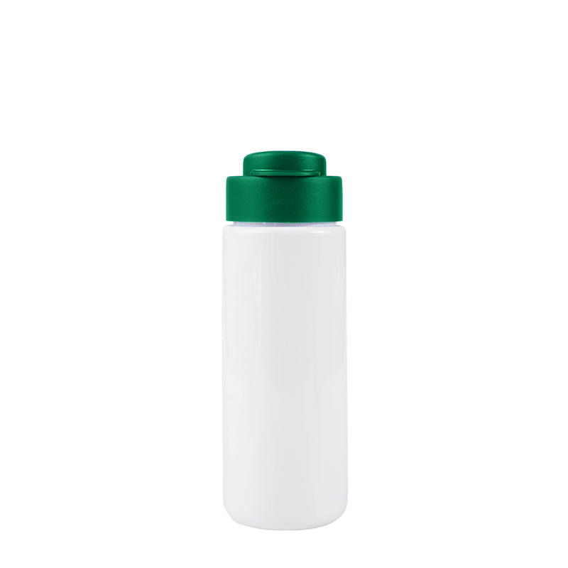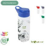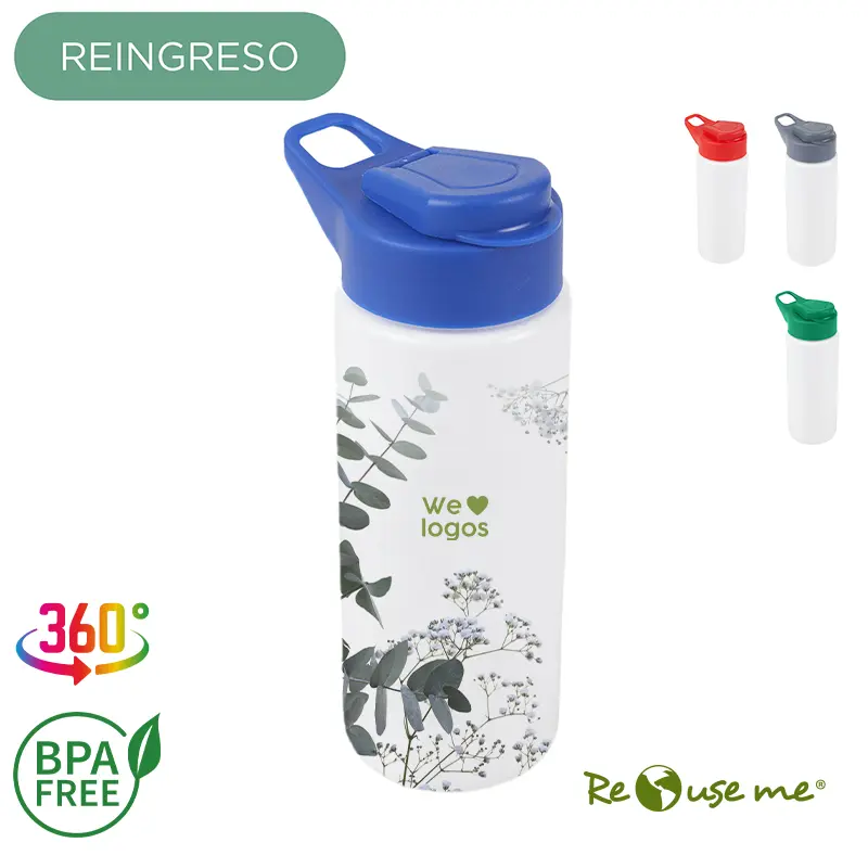 Botella reutilizable de PET con tapa de Polipropileno, cuenta con un agarre en la tapa para su transporte. No es apta para bebidas calientes, lavavajillas ni microondas. Medida: 19.8 cm x diámetro 6.5 cm. Ancho de la tapa 9.2 cm. Capacidad: 600ml. Reuseme