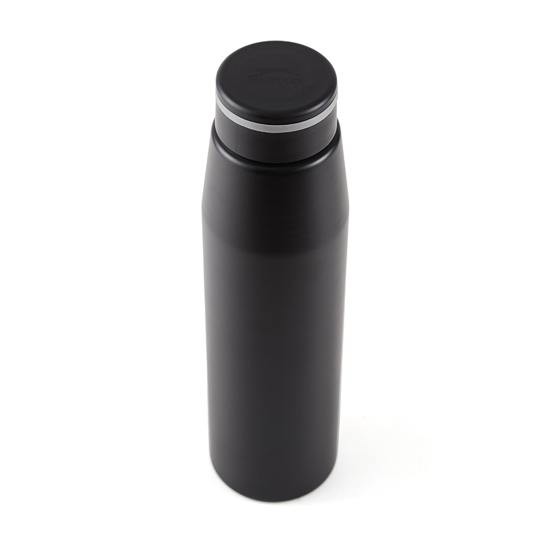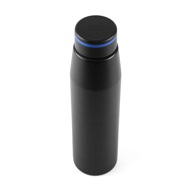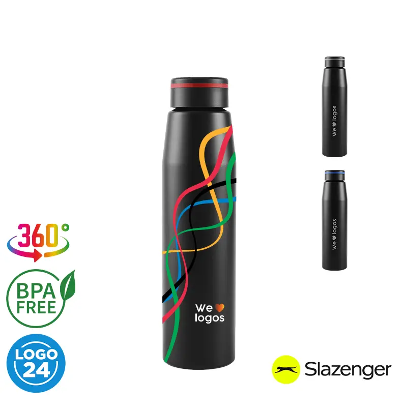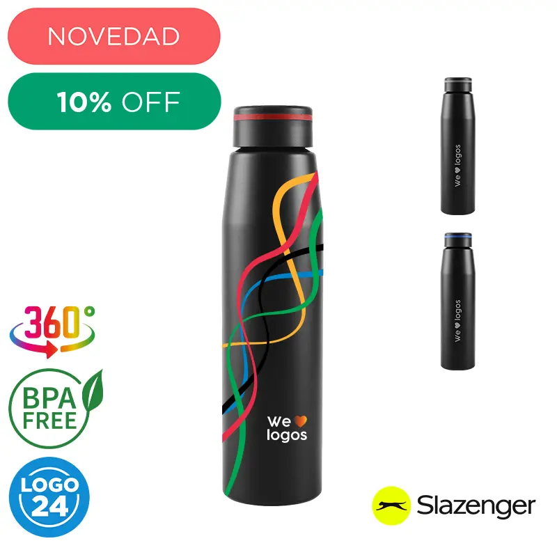 Botella de 700 ml fabricada en aluminio con tapa negra a rosca con banda de silicona de color gris, roja o azul. Ideal para tus actividades deportivas y al aire libre. Con impacto positivo en el medio ambiente, esta botella reutilizable te ayuda a reducir el consumo de plástico de un solo uso. Dimensiones: 25,5 cm x 7 cm (Altura x Diámetro). Producto libre de BPA y aprobado por el I.N.A.L. para el contacto con alimentos. Presentado en GiftBox. Apta solo para bebidas frías. Slazenger.