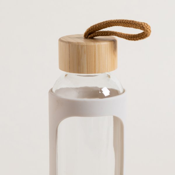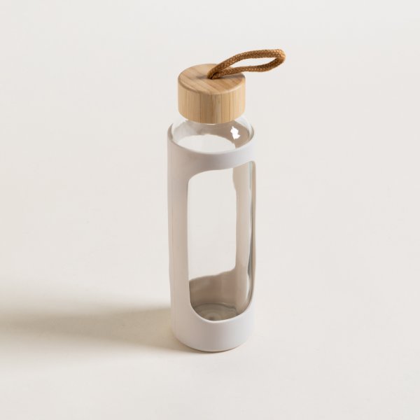 Botella de vidrio con funda de silicona color crema y tapa de bamboo.