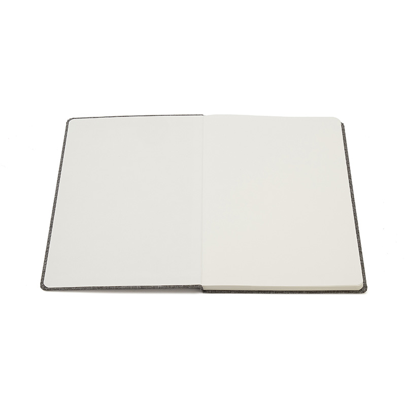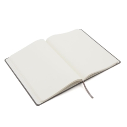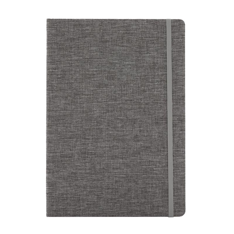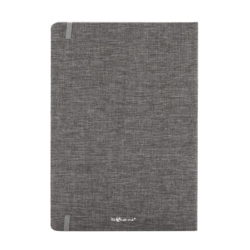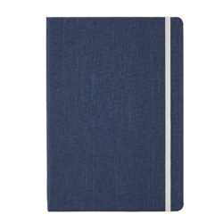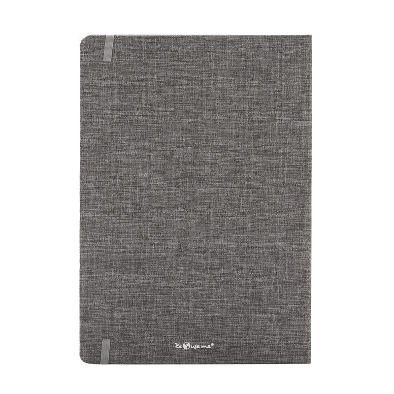 Cuaderno de tapa confeccionado con material RPET, hecho con botellas de plástico reciclado. Cuenta con una cinta marcadora y un cierre elástico. 96 hojas lisas de 70g de bordes redondeados. Medidas: 17,6 x 25cm. ReUseMe.