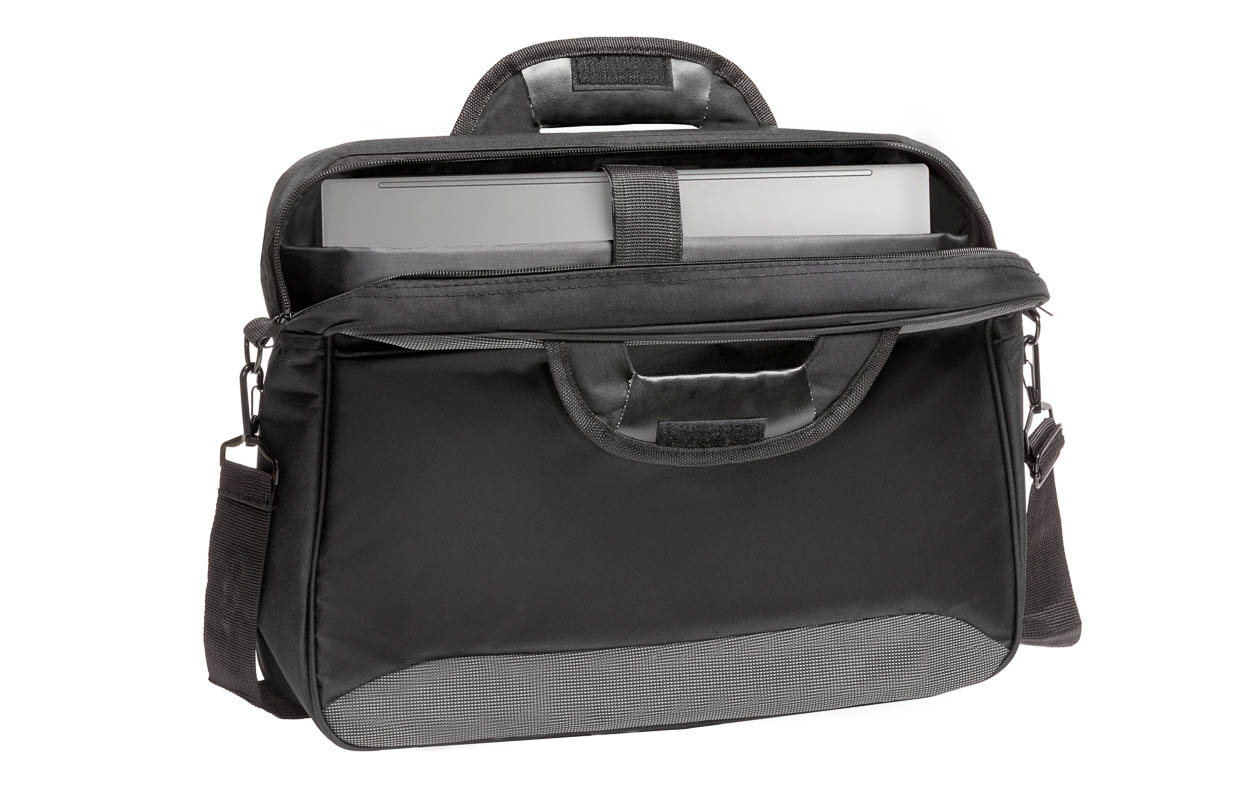 Maletín para notebook de hasta 15,6, fabricado en poliéster 600D y 300D con compartimiento forrado y separación acolchada para notebook. Cuenta con un bolsillo frontal con varios compartimentos interiores. En la parte posterior, dispone de una cinta para transportarlo en el carry on. Tiene cinta ajustable con refuerzo acolchado.Capacidad: 9 litrosTipo de Pack: Nada | Peso Bruto: 403 gr | Largo: 45 cm | Ancho: 7 cm | Alto: 33 cmCaja MasterUn/CM: 20 | Peso bruto: 9,74 kg | Largo: 47 cm | Ancho: 36 cm | Alto: 42 cm | Volumen: 71,064 lt, Materiales: Poliéster
