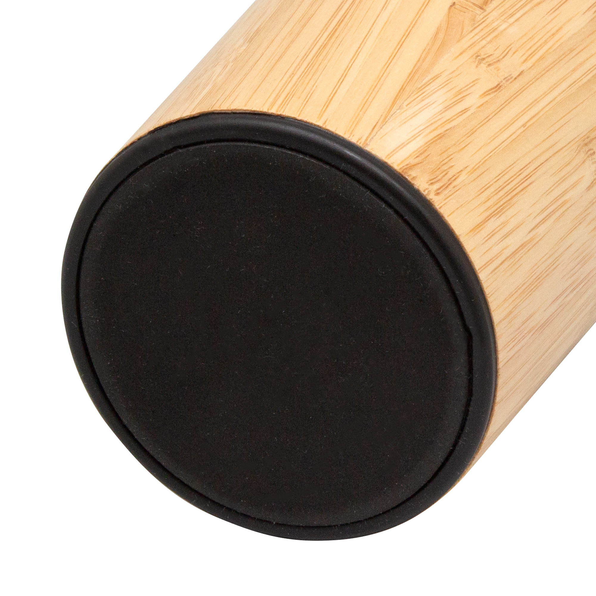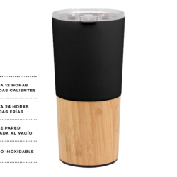 Mug doble pared, sellado al vacío. Interior en acero 304 / exterior en acero 201, con detalles de Bambú. Tapa plástica transparente a presión con anillo de silicona. Mantiene hasta 12 hs la temperatura de las bebidas calientes y 24 hs de las bebidas frías.
