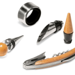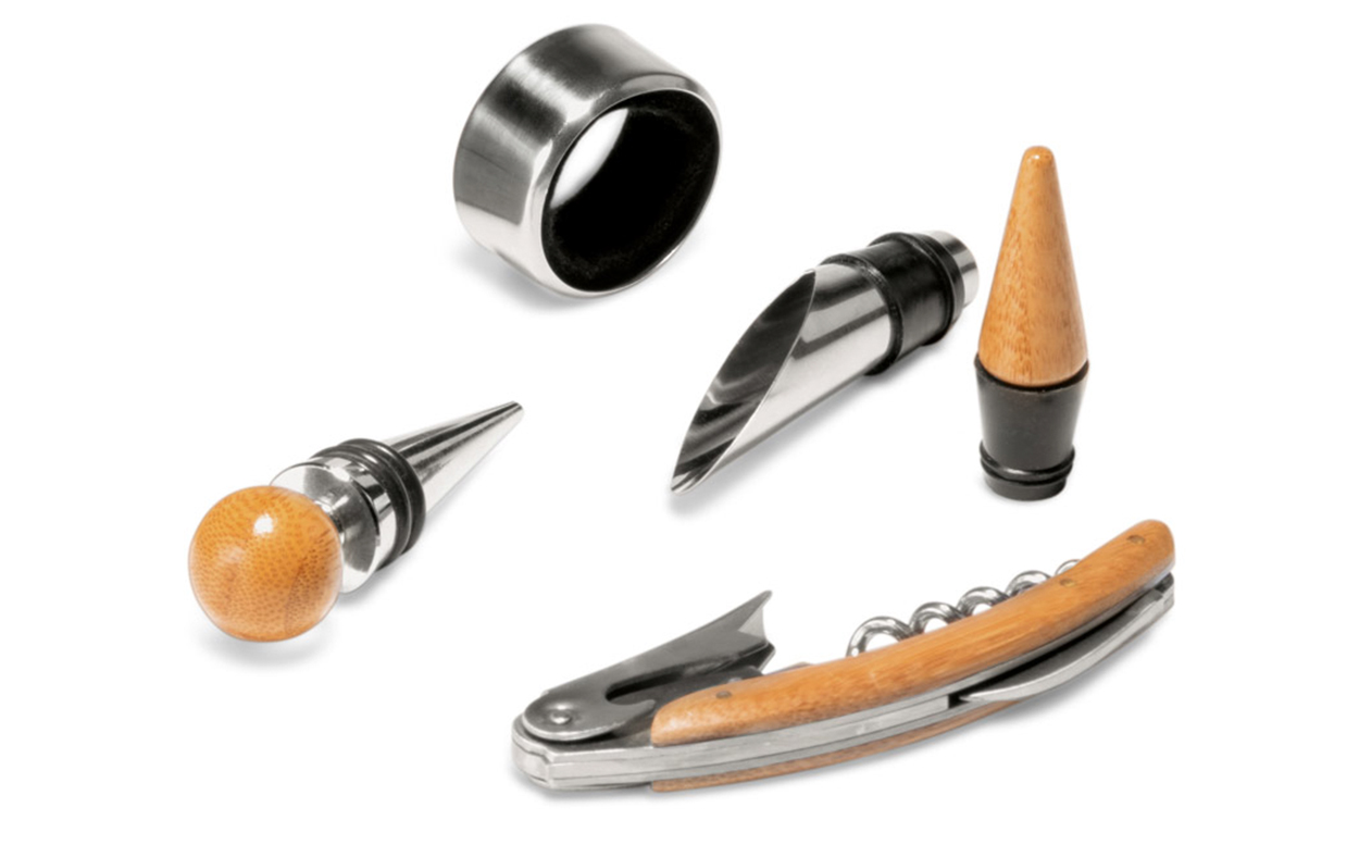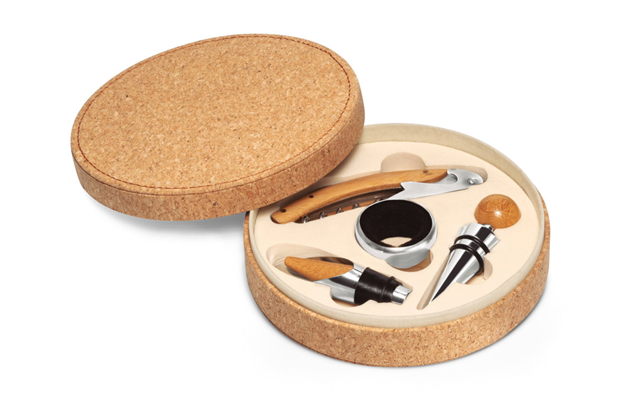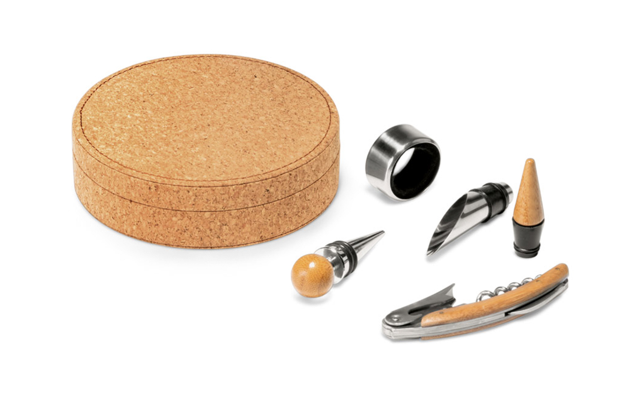 Set de vino que contiene 4 piezas, fabricadas en madera y metal. Incluye sacacorchos con navaja sommelier, gargantilla recoge gotas, un dosificador y tapón. Se suministra en una caja de regalo Eco Cork.Tipo de Pack: Caja | Peso Bruto: 335 gr | Largo: 17 cm | Ancho: 4,5 cm | Alto: 17 cmCaja MasterUn/CM: 24 | Peso bruto: 8,64 kg | Largo: 35 cm | Ancho: 35 cm | Alto: 31 cm | Volumen: 37,975 lt, Materiales: Bambú, Metal, Corcho