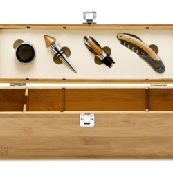 Set de vino que contiene 4 piezas, fabricadas en madera y metal. Incluye sacacorchos con navaja sommelier, gargantilla recoge gotas, un dosificador y tapón. Se suministra en una caja ecológica de regalo de bambú y zinc.