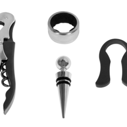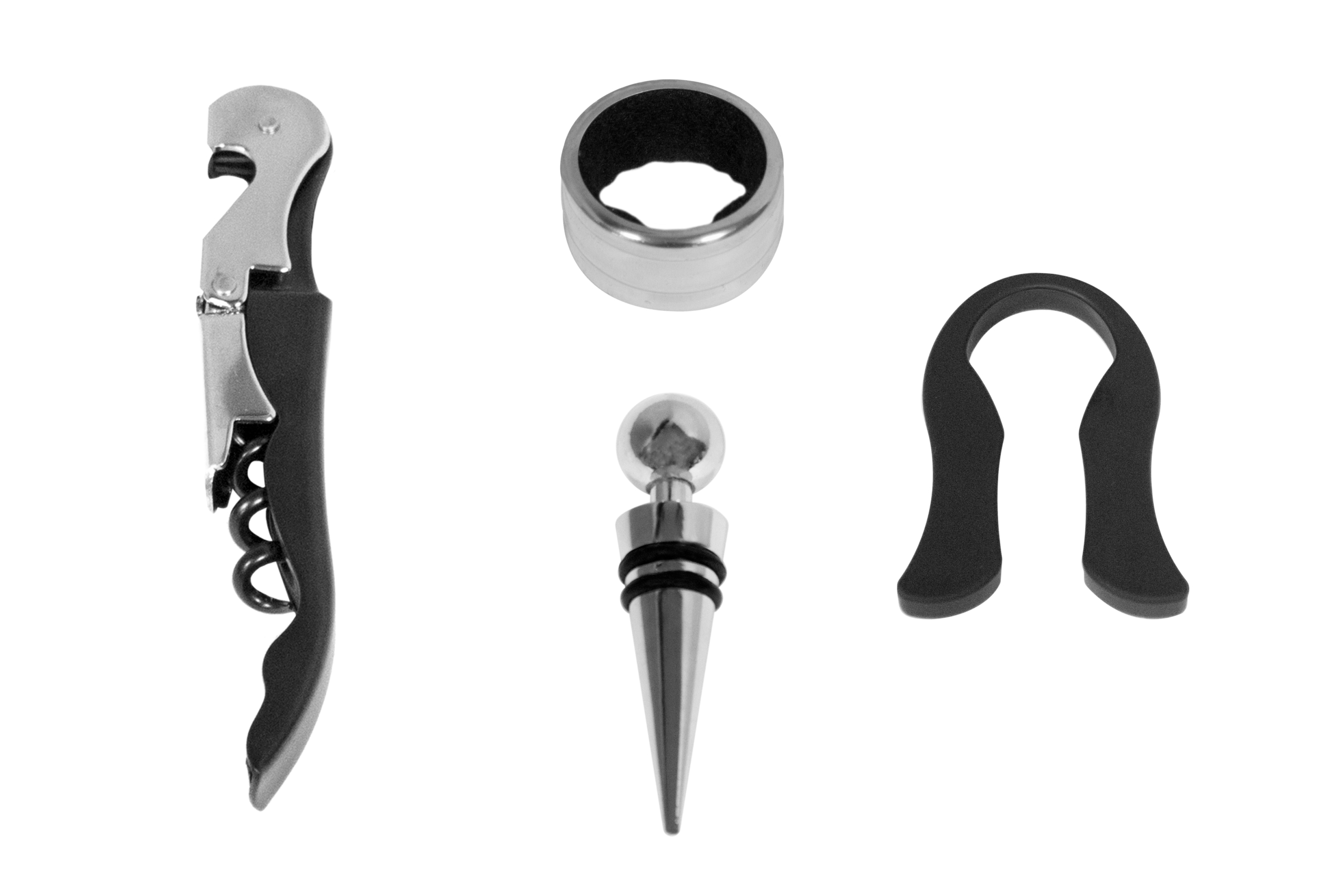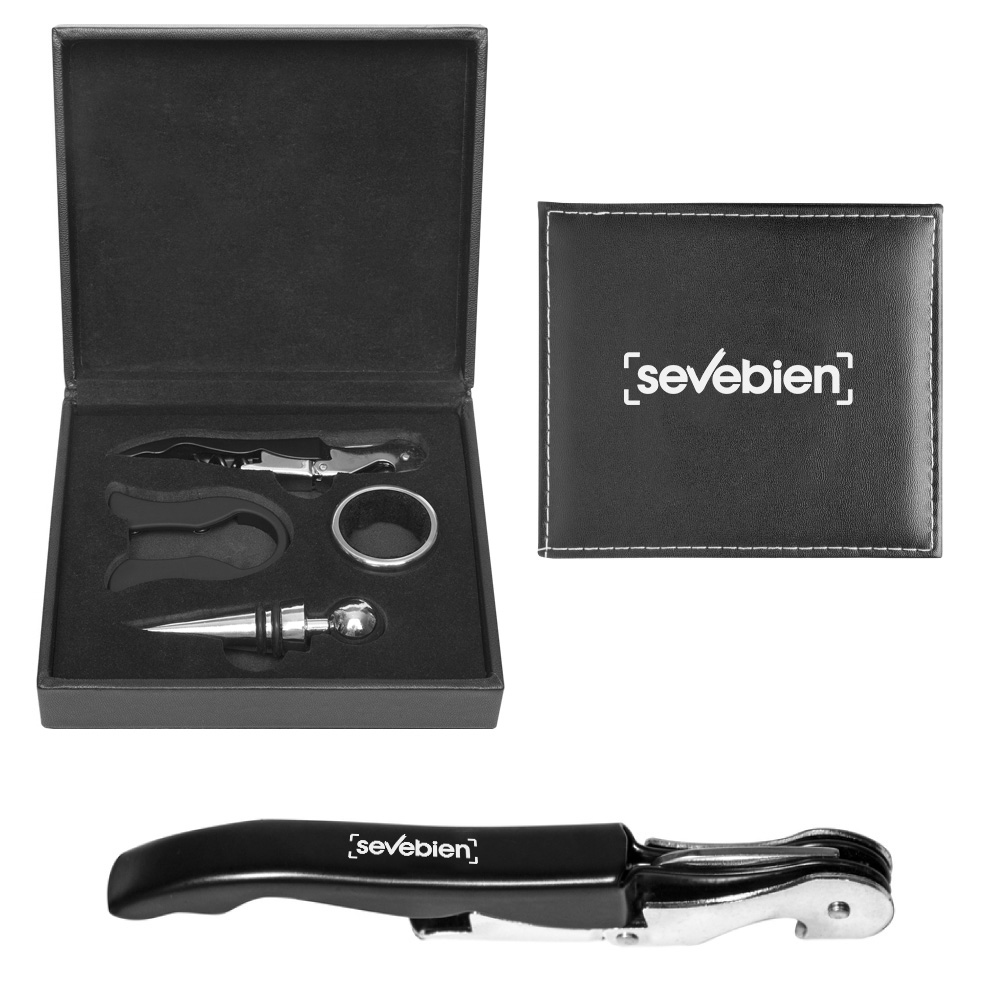 Accesorios para vino en estuche de simil cuero. Cuenta con sacacorcho, anillo antigoteo, tapón y corta cápsula. Presentación en caja de regalo.
